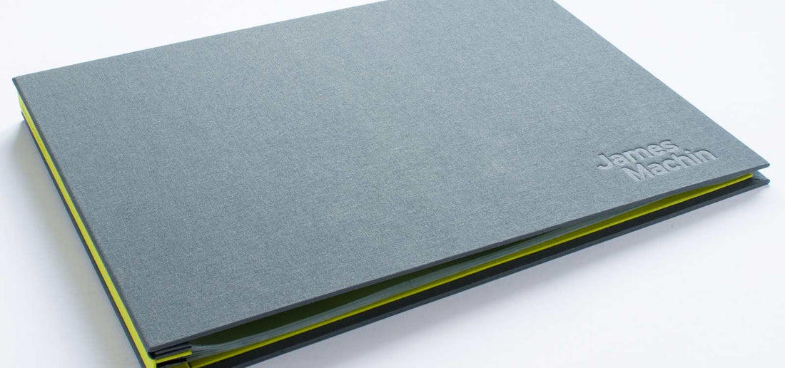 Some colours work really well together for a presentation portfolio and Plate Grey and Doon Green are great examples. James chose a hidden screw post portfolio and went the extra mile (well £35) and got an extra die made for blind debossing his name on the spine as well as the cover.
