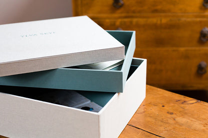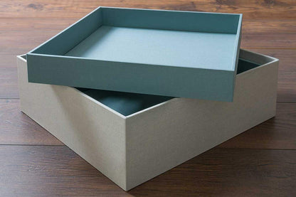 The lidded shoulder box, is essentially boxes made within boxes and each box is individually hand made using traditional bindery techniques like double laminated grey board walls that are then step jointed and glued. These take time but they offer you the strongest box possible made from board. Each one is also fabric lined. Also available with these are trays that sit within the box.