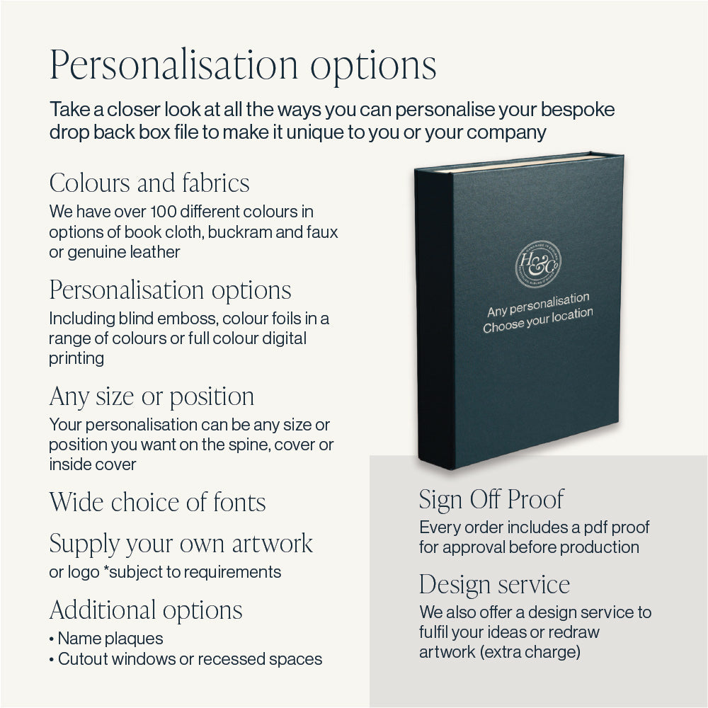 Luxury box files Individually hand crafted and bespoke, that can be made in any size with ring binder mechanisms ranging from 25mm to 100mm. Furthermore these are also available in the widest variety of fabrics, leathers, colours and personalisation options. Hand made to the highest quality, our drop back box binders will provide you the ideal personalised storage solution.