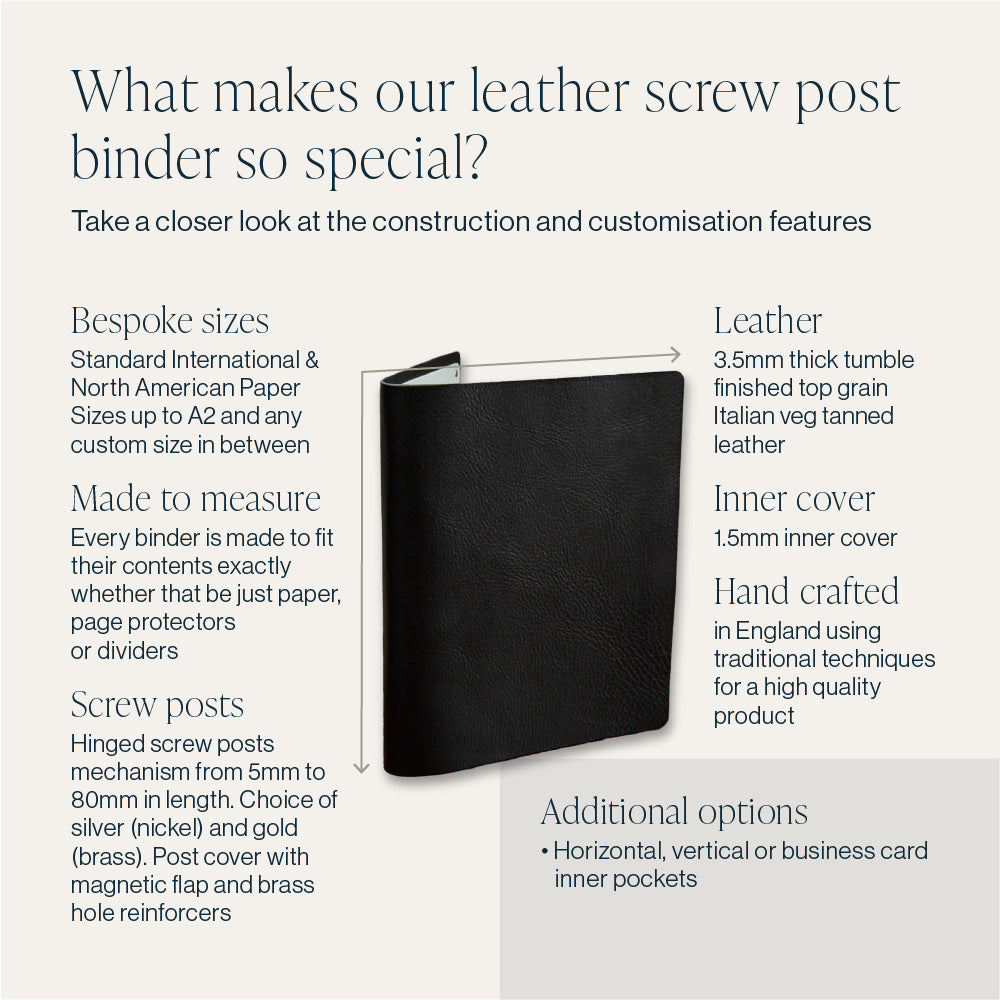 Each screw post binder is sized so that the contents sit perfectly on the inner cover. We then add approximately 8mm to the top, bottom and side for the overall cover size.