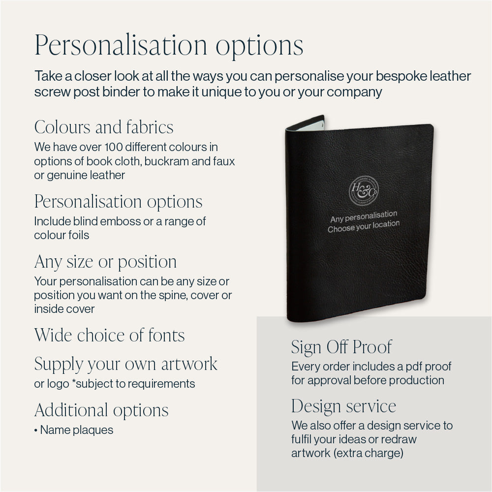 Consisting of a single piece of 3.5mm thick, Italian veg tanned leather that has been tumble finished to give it softness and texture. To this is attached a back board covered in book cloth and a hinged screw and post mechanism. Add text and a logo and you have an outstanding personalised luxury presentation book, guest book or album.